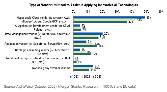 Demaecker zitiert eine Umfrage von AlphaWise und Morgan Stanley Research, wonach die IT-Verantwortlichen in den Unternehmen es bevorzugen, dass bestehende Anwendungsanbieter KI implementieren, anstatt bestehende Systeme durch KI zu ersetzen.