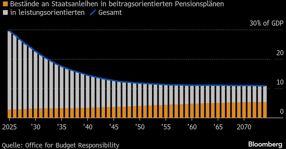 Großbritannien könnte in den kommenden Jahrzehnten mit einem Anstieg der jährlichen Zinskosten um 22 Milliarden Pfund konfrontiert sein, da Pensionsfonds weniger britische Staatsanleihen kaufen.