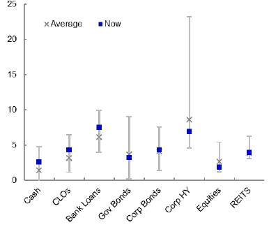 Im weiten Verlauf seines Vortrages analysierte Jackson die fundamentale Bewertung der wichtigsten Asseklassen über einen Vergleich ihrer aktuellen Rendite und ihrer historischen Durchschnittsrendite. Conclusio: Während risikobehaftete Segmente wie Aktien (insbesondere jene aus den USA), REITS oder High Yield Bonds Investoren derzeit unterdurchschnittliche Renditen bieten, gelten auf der anderen Seite „Cash“, Staatsanleihen, CLOs und insbesondere Bank Loans als attraktiver bewertet. Siehe nachfolgende Grafik: