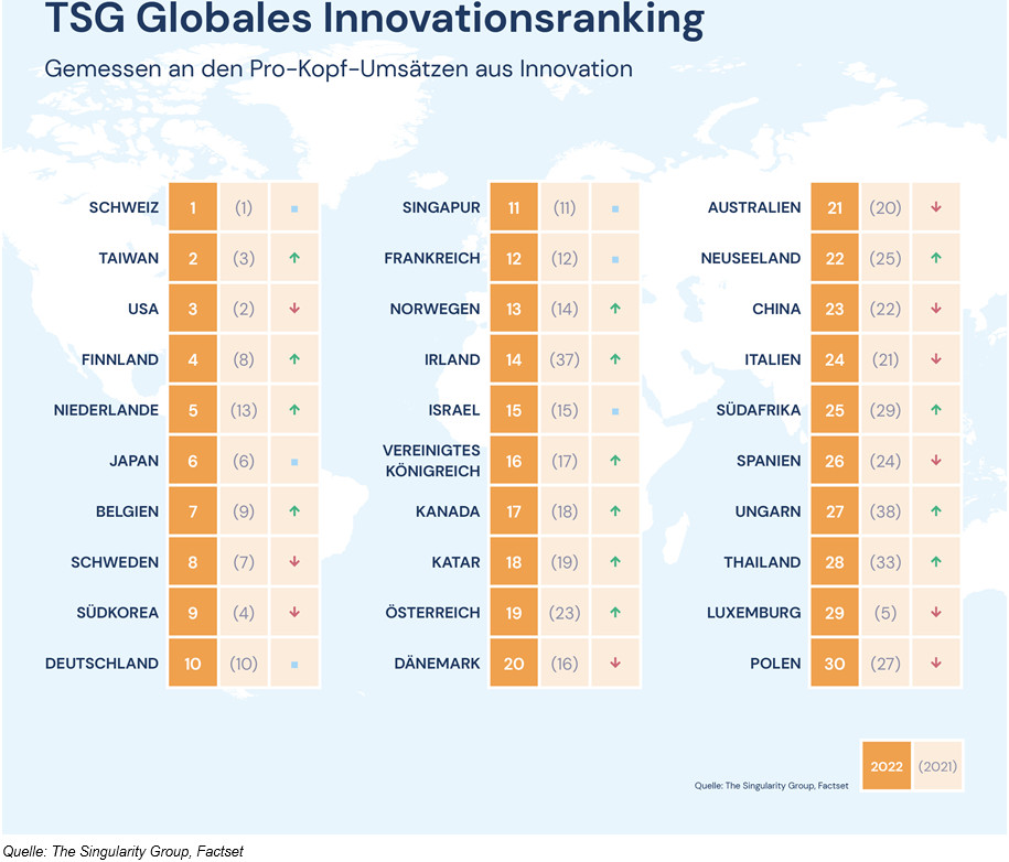 Gemessen an den Pro Kopf-Umsätzen aus Innovation liegt die Schweiz deutlich vor Taiwan und den USA. Deutschland befindet sich auf Rang 10 und Österreich auf Rang 19. Das ist ein Resultat der von The Singularity Group (TSG) durchgeführten Untersuchung.