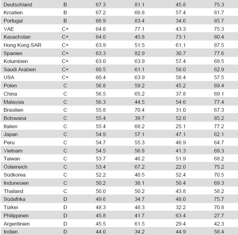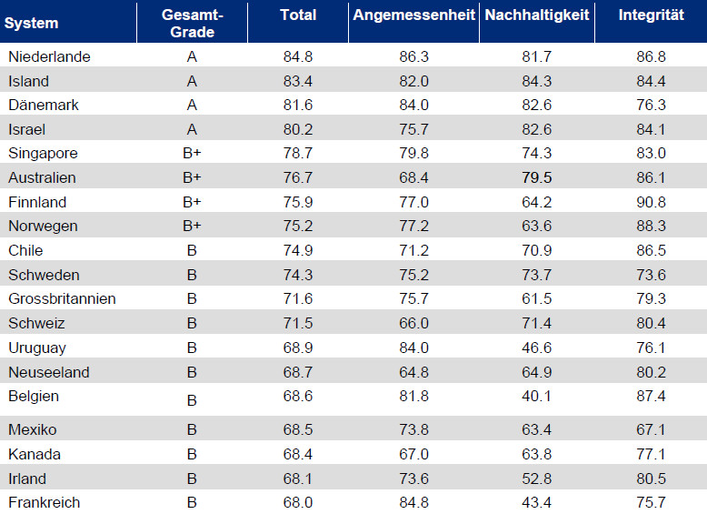 Im diesjährigen Index erzielte Deutschland mit 67.3 eine leicht höhere Punktzahl als in den vergangenen Jahren, rutschte jedoch im Ländervergleich um einen Rang nach unten auf den 20. Platz. Obwohl das deutsche Rentensystem, bestehend aus gesetzlicher Rente, privater und betrieblicher Altersversorgung, mit Rang 9 in der Sub-Kategorie „Angemessenheit“ gut abschneidet, erzielt es in der Sub-Kategorie „Nachhaltigkeit“ – und hier geht es in erster Linie um die Frage, wie zukunftssicher das System eingeschätzt wird – nur den 33. Rang und kommt auch in der Kategorie „Integrität“ nur auf den 27. Platz. Wesentliche Gründe hierfür sind unter anderem das umlagefinanzierte System der gesetzlichen Rentenversicherung sowie eine anders als in anderen Ländern lediglich freiwillige Ausfinanzierung der betrieblichen Altersversorgung.