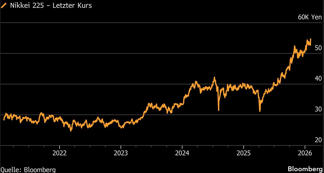 “Jegliche Vorsicht scheint verschwunden zu sein”, sagte Kazuhiro Sasaki, Analysechef bei Phillip Securities Japan, gegenüber Bloomberg. “Der Yen ist deutlich schwächer als in der vergangenen Woche, die Regierungspartei in Japan scheint bei der Wahl klar zu gewinnen, und die Gewinne aus Schlüsselbranchen wie Halbleitern wirken stark”, sagte er mit Blick auf die vorgezogene Wahl am 8. Februar. Auch die relative Ruhe auf dem Edelmetallmarkt nach dem Einbruch am Wochenende stärke das Vertrauen der Anleger, ergänzte Sasaki.