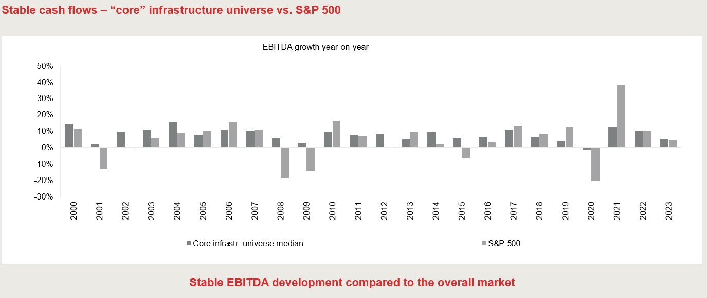 Im dritten Quartal dieses Jahres war Core Infrastructure mit einem EV/EBITDA von ca. elf günstiger bewertet als marktbreite Aktienindizes wie der MSCI World oder der S&P 500, die mit einem EV/EBITDA-Multiple von fast 14 bzw. 15 notieren.