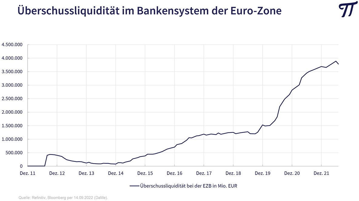 Doch jetzt mal im Ernst: Was hat das alles mit der Börse zu tun? Peter E: Huber führt aus: "Diverse Krisen bündeln sich derzeit zu einem perfekten Sturm. Und so wie es aussieht, steht uns das Schlimmste noch bevor. Entsprechend groß ist die Skepsis der Anleger. Doch wenn alle nur noch schwarzsehen, sollte man nachdenklich werden. Vielleicht stehen wir sogar vor einer neuen Aufwärtsbewegung, da das Geld, das in der Wirtschaft nicht für Investitionen benötigt wird, traditionell an die Börsen fließt. Und welcher Wahnsinnige würde in einem solchen Umfeld noch investieren wollen, außer dem Staat. Und bei dem hinkt der Ausbau der alternativen Energien aufgrund von Materialengpässen und bürokratischen Hemmnissen weit hinter den Planungen hinterher. Insgesamt hat sich im Euroraum eine große Menge an Überschussliquidität, nicht-reservepflichtige Einlagen von Banken bei der EZB - angesammelt."