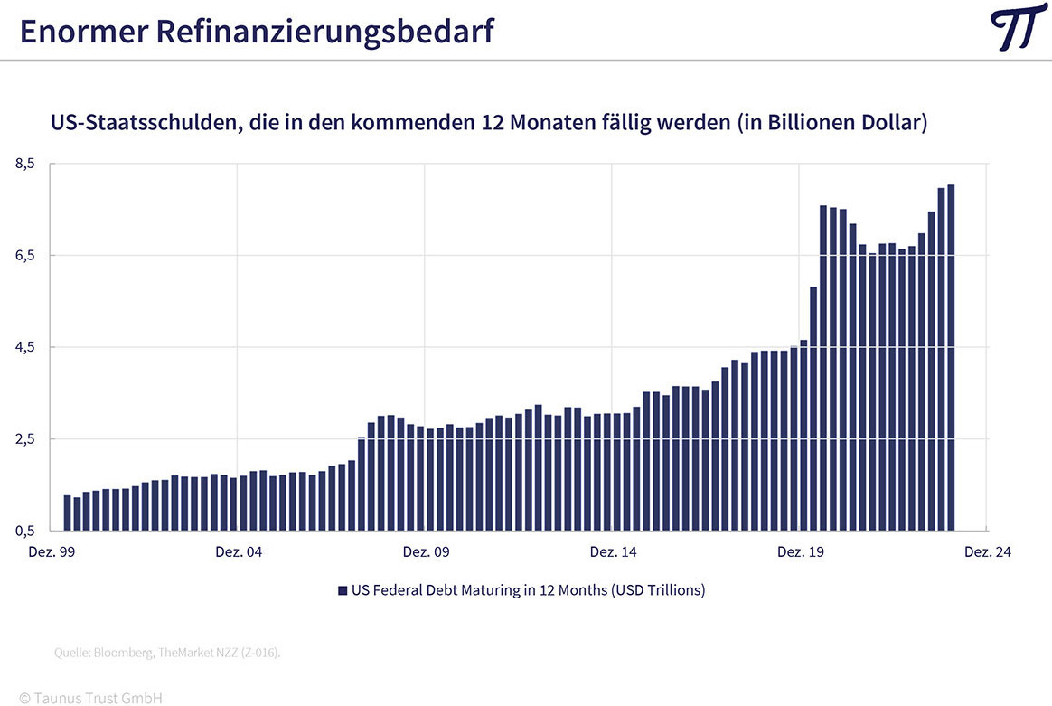 Huber: "Dies liegt zum einen an einer Explosion der Staatsschulden. In den USA werden Budgetdefizite in Höhe von sieben Prozent des Bruttosozialprodukts gefahren. Die Bank of America schätzt, dass das Budgetdefizit 2024 auf 1.800 Milliarden US-Dollar steigen wird und neue T-Bonds im Rekordvolumen von 1.340 Milliarden US-Dollar ausgegeben werden. Dazu kommt eine ungünstige Schuldenstruktur. So hat das US-Schatzamt 2023 überwiegend Geldmarktpapiere emittiert. Dadurch entsteht ein enormer Refinanzierungsbedarf. Allein in den nächsten zwölf Monaten werden US-Staatsschulden von über 8.000 Milliarden US-Dollar fällig. Es ist mir schleierhaft, wer diese Flut von T-Bonds aufnehmen soll. Große ausländische Käufer wie China bauen ihre Bestände eher ab, nachdem die USA angefangen haben, den Dollar als Waffe einzusetzen. Und auch die US-Notenbank will ihre Bestände eher abbauen."