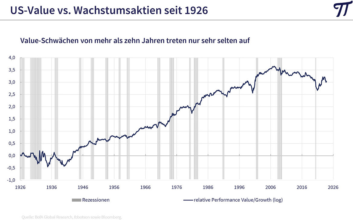 Betrachtet man die Börsenentwicklung seit 1925 gab es nur zwei langjährige Anlagezeiträume, in denen Wachstumsaktien besser abschnitten als Substanzwerte: 1929 bis 1938 und 2010 bis 2021. Die langfristige Outperformance der Value-Aktien sei auch wissenschaftlich nachvollziehbar, so Huber weiter. "So sind Wachstumsaktien oft wegen ihrer Zukunftsfantasie sehr hoch bewertet. Lässt das Gewinnwachstum nach, weil immer mehr Unternehmen in das lukrative Geschäftsfeld eintreten und sich die Burggräben als doch nicht so stabil erweisen, tritt eine Bewertungskontraktion ein. Bei langweiligen Titeln, die wenig Wachstum erwarten lassen und die deshalb niedrig bewertet sind, kommt es dagegen oft zu positiven Überraschungen. Es ist deshalb nur eine Frage der Zeit, bis Value-Aktien wieder Freude machen. Bis dorthin kann man sich mit hohen Ausschüttungen verwöhnen lassen."