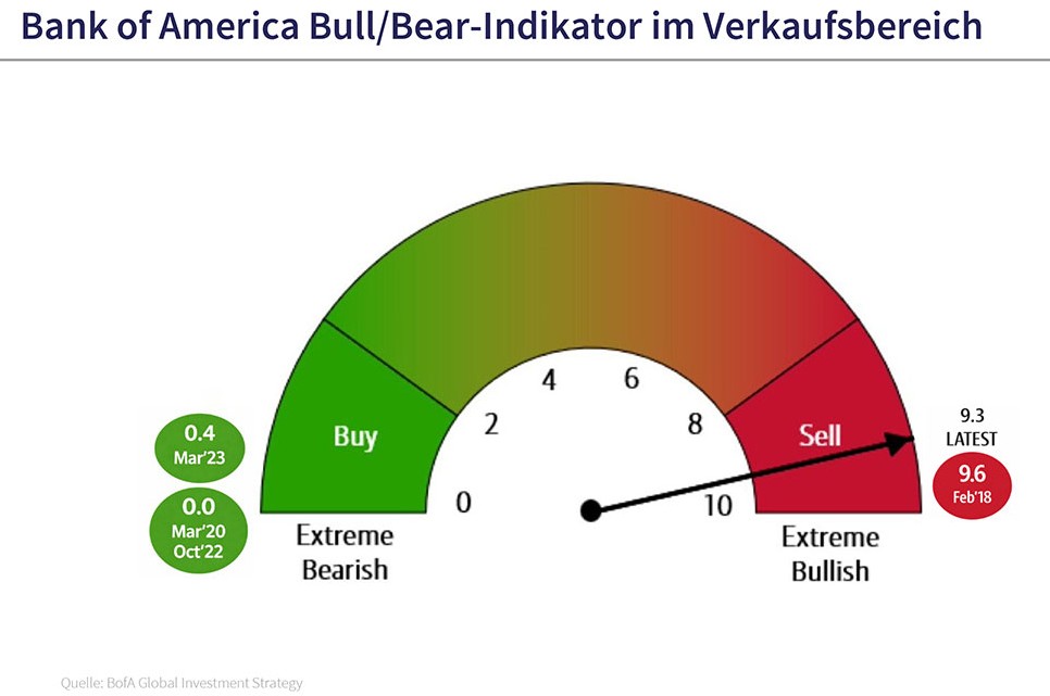 Es gibt genug Warnzeichen, die darauf hinweisen, dass es nicht unbedingt klug ist, jetzt verstärkt Aktien zu kaufen. Anleger waren selten so hoch wie aktuell investiert, und die Barreserven amerikanischer Aktienfonds sind auf einem Rekordtief. Die Sentiment-Indikatoren befinden sich am Anschlag.