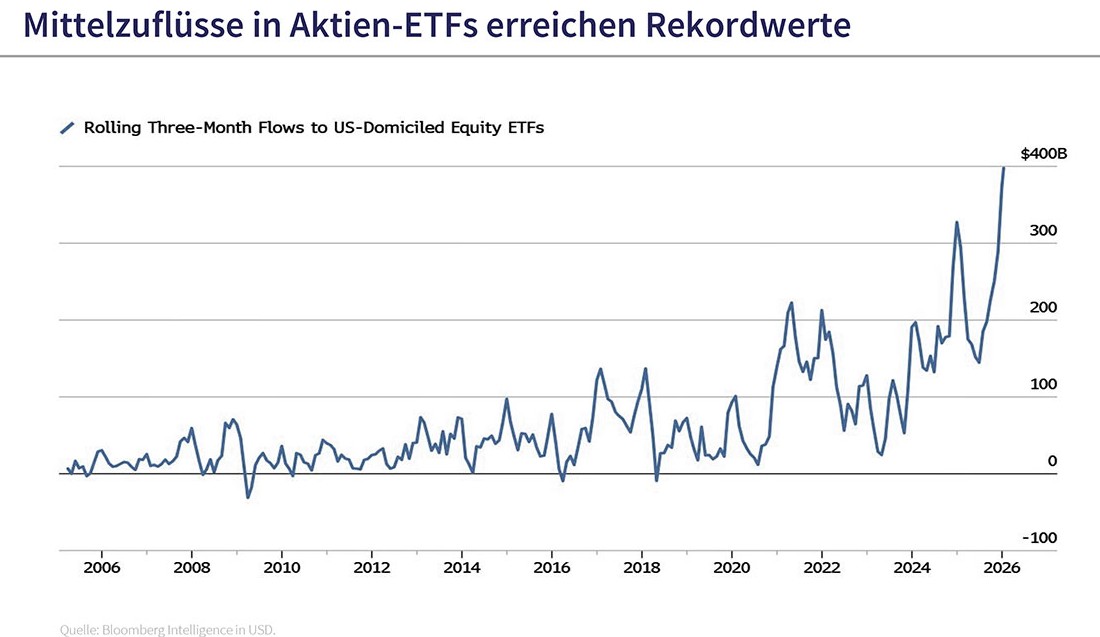 Trotz dieser Warnsignale haben die Anleger in den letzten Monaten munter weiter gekauft und die Rekordsumme von 400 Milliarden US-Dollar neu in US-Aktien-ETFs gepumpt, wie die folgende Grafik illustriert: