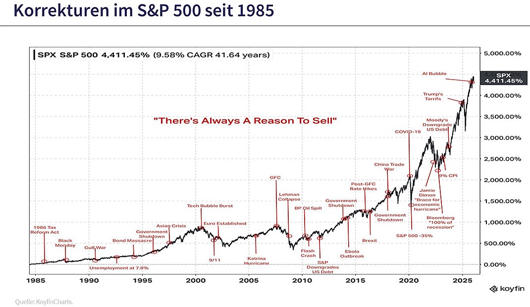 "Der aktuelle Melt-up-Boom wird verursacht durch die Flucht der Anleger in Sachwerte (Aktien, Edelmetalle, Rohstoffwerte) und raus aus den Anleihen und Währungen überschuldeter Staaten. Auch der Euro ist eine Schwachwährung und profitiert lediglich von der Verlagerung aus dem Dollarbereich. Doch auch in solchen Aufwärtstrends sind scharfe Korrekturen nichts Ungewöhnliches oder gar ein Unglück. Sie sind im Gegenteil wie ein reinigendes Gewitter, das die Bewertungen wieder in normale Größenordnungen bringt (mean reversvion). Die schwachen Hände werden abgeschüttelt, wie Altmeister Kostolany zu sagen pflegte", ist Peter E. Huber überzeugt.