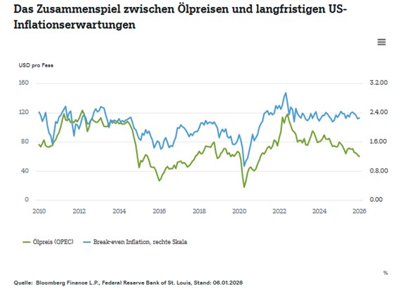 Über Jahre hinweg liefen die US-Breakeven-Inflationsraten und der Ölpreis im Gleichschritt. Sogenannte Breakeven-Inflationsraten beziffern die Zinsdifferenz zwischen inflationsindexierten und nominalen Staatsanleihen und gelten allgemein als Indikator für die Inflationserwartungen am Anleihemarkt. Interessanterweise korrelieren diese Inflationserwartungen stark mit dem Ölpreis, wie unser „Chart der Woche“ zeigt. Dass es hierbei Zusammenhänge mit Energiepreisen geben soll, ist kein Wunder. Öl schlägt direkt auf die Verbraucherpreise durch, vor allem über Energie und Transportkosten. Und: Der Ölpreis ist ein Seismograf für die Weltkonjunktur. Fällt er, wittern viele schwächere Nachfrage und erwarten niedrigere Zinsen.