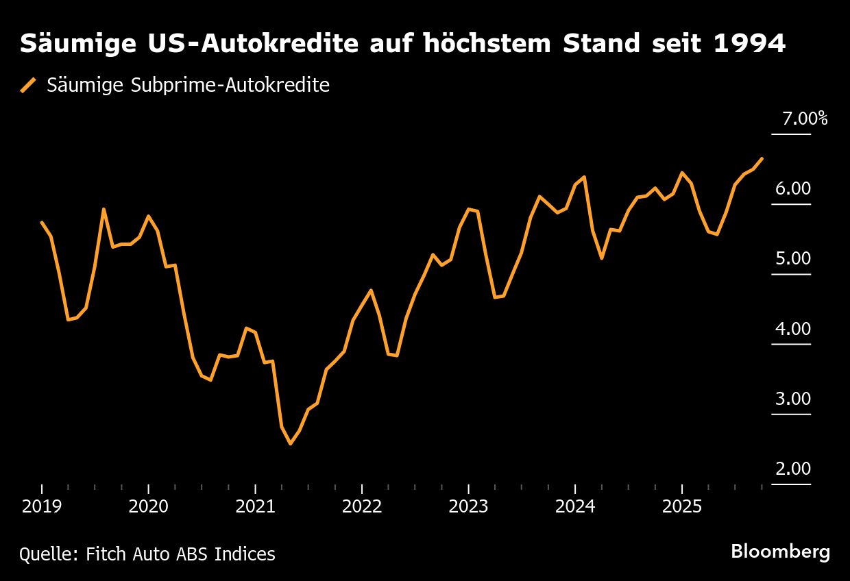 In den USA sind so viele Menschen wie nie zuvor mit ihren Autokrediten in Verzug geraten. Der Anteil der Subprime-Kreditnehmer, die mit ihren Zahlungen mindestens 60 Tage im Rückstand sind, ist im Oktober auf 6,65 Prozent gestiegen. Das ist laut Fitch Ratings der höchste Wert seit Beginn der Datenerhebung im Jahr 1994. Darüber informiert Bloomberg News.