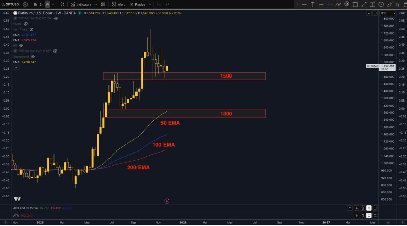 Wöchentlicher Platin-Kerzenchart mit 50-, 100- und 200-EMA-Indikatoren