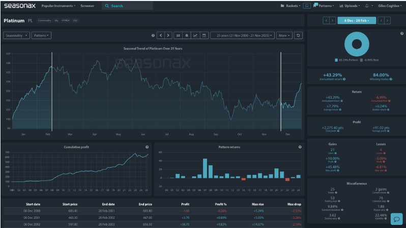 Die folgende Grafik zeigt, dass Platin in den letzten 25 Jahren vom 6. Dezember bis zum 20. Februar eine durchschnittliche Rendite von plus 7,79 Prozent erwirtschaftet hat – bei einer Trefferquote von 84 Prozent und einer beeindruckenden annualisierten Rendite von 43,29 Prozent.