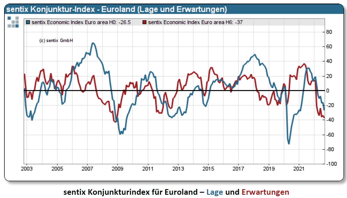 Die Verschlechterung der Konjunktur in der Eurozone trägt inzwischen historisch einmalige Züge. Nie zuvor in der mehr als 20jährigen Historie, mit Ausnahme der Finanzkrise im Jahr 2008, war die Lagebeurteilung der Anleger im Rahmen der sentix-Umfrage zur Euroland-Konjunktur so schwach – und die Erwartungswerte gleichzeitig ebenfalls so niedrig. Das hält sentix-Geschäftsführer Manfred Hübner in einer aktuellen Analyse fest.