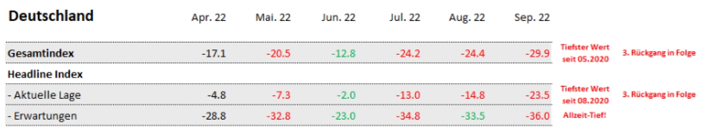 Anfang September sinkt der Euroland-Gesamtindex um 6,6 Punkte auf -31,8 Punkte. Dies ist der niedrigste Wert seit Mai 2020. Die Lagewerte brechen um mehr als 10 Punkte auf -26,5 Zähler ein. Zwar ist dies „nur“ der niedrigste Wert seit Februar 2021, doch ist damit eine Stagnation der Euroland-Konjunktur quasi bestätigt.