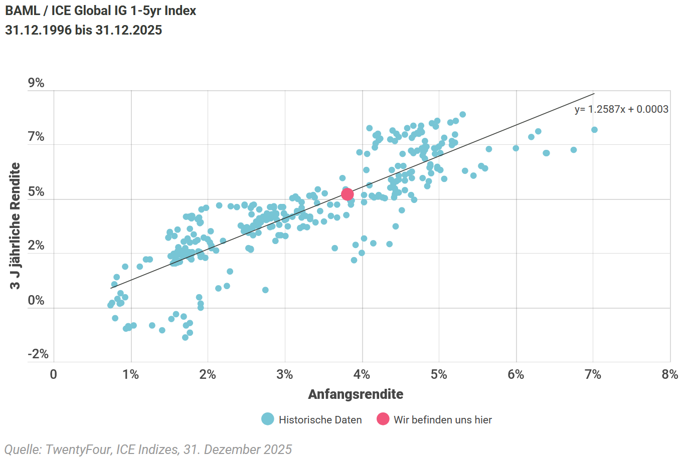 Bei den aktuellen Spreads sind die Möglichkeiten für eine Spread-Einengung im Jahr 2026 begrenzt. Allerdings gibt es angesichts der zu erwartenden weiteren Zinssenkungen durch die US-Notenbank Fed und die Bank of England weiterhin moderate Chancen auf Kursgewinne durch den Zinseffekt bei kurzlaufenden Fonds. „Wie in Grafik zwei zu sehen ist, bleibt die aktuelle Anfangsrendite selbst bei engen Spreads sowohl absolut als auch im historischen Vergleich attraktiv: Der rote Punkt zeigt, wo die Anfangsrendite derzeit liegt. Sie ist weiterhin günstiger als im historischen Durchschnitt dieses Datensatzes, der bis Ende 1996 zurückreicht“, merkt Bowie an.