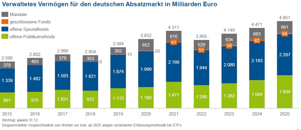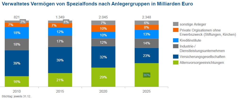 Von Pensionskassen, Versorgungswerken und anderen Einrichtungen der Altersvorsorge stammten im vergangenen Jahr 36 Prozent des Spezialfonds-Vermögens. Dieses stieg 2025 auf knapp 2,35 Billionen Euro, gegenüber knapp 2,05 Billionen Euro im Vorjahr.