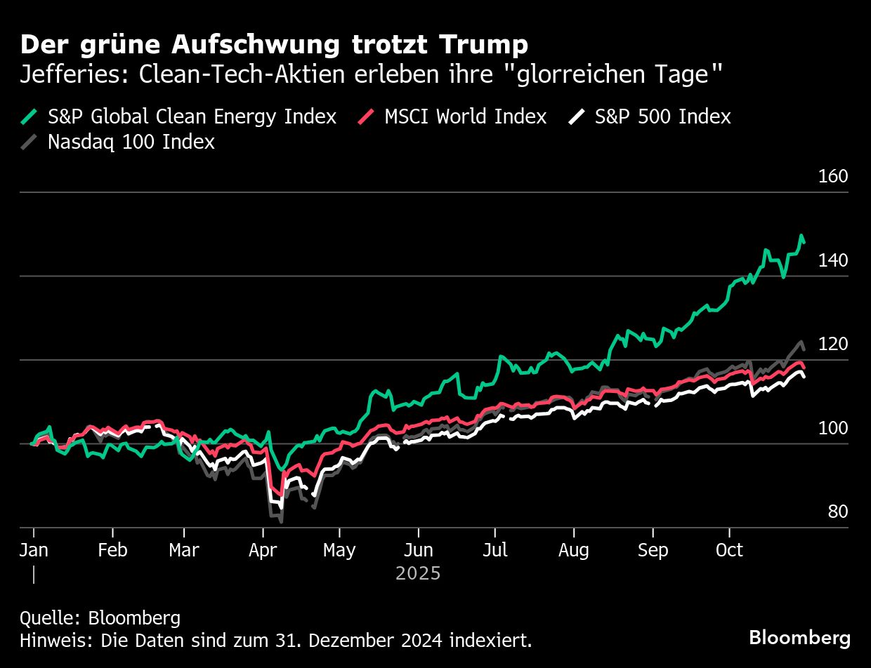 Nicht nur die Rally, sondern auch deren Zeitpunkt kommt für viele Marktteilnehmer wohl überraschend: Obwohl Präsident Donald Trump zahlreiche US-Regierungsprogramme zur Förderung von Wind-, Solar- und Elektromobilität gestrichen hat, zählen grüne Aktien in diesem Jahr zu den lukrativsten Investments. Die Titel übertreffen die meisten anderen Börsenindizes deutlich. Der S&P-Hauptindex für saubere Energie verzeichnet in diesem Jahr ein Plus von rund 50 Prozent, während der MSCI World Index weniger als 20 Prozent zulegte. Das berichtet Bloomberg News mit Verweis auf nachfolgende Grafik:
