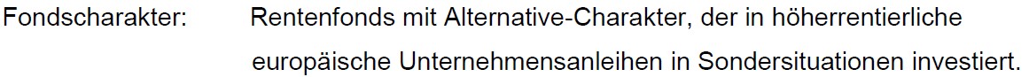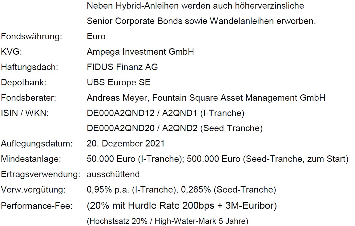 Der Fonds positioniert sich im Bereich Alternative Fixed Income. Meyer selektiert im Wesentlichen Hybridanleihen, Senior Non-Investmentgrade-Unternehmensanleihen sowie Wandelpapiere in Sondersituationen, die deutlich höhere Renditen erwarten lassen als klassische Investment Grade-Titel. Als Haftungsdach hat der Anleiheexperte die FIDUS Finanz AG ausgewählt. Als Kapitalverwaltungsgesellschaft fungiert Ampega Asset Management und als Verwahrstelle wird die Schweizer Großbank UBS tätig.