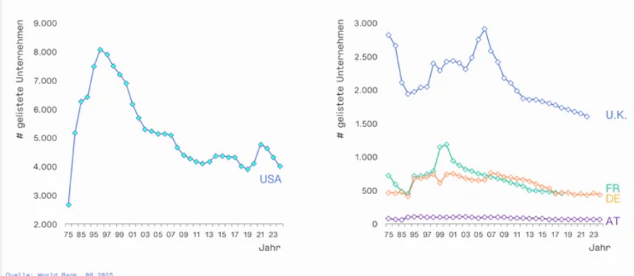 Der folgende Chart der Security KAG zeigt einen bemerkenswerten, oft übersehenen Trend: Die Zahl der börsennotierten Unternehmen hat sich seit dem Hoch um die Jahrtausendwende in vielen Regionen nahezu halbiert. In den USA ist die Zahl der gelisteten Firmen seit 1996 von über 8.000 auf rund 4.000 gefallen. In Europa zeichnet sich ein ähnliches Bild ab. Das Angebot an investierbaren Aktien schrumpft, während gleichzeitig die Nachfrage rasant steigt.
