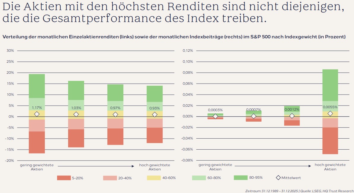 „Der Wert von 0,0003 Prozent wirkt zunächst vernachlässigbar. Tatsächlich verteilt sich der Beitrag einer einzelnen Aktie jedoch auf einen breit diversifizierten Index mit 500 Titeln – und wird zudem auf Monatsbasis gemessen", gibt Dörr zu bedenken. „Die Analyse verdeutlicht: Die Indexperformance ist in erster Linie eine Frage der Gewichtung, nicht der höchsten Einzelrenditen. Selbst sehr erfolgreiche Aktien bewegen den Index kaum, wenn ihr Anteil gering ist. Umgekehrt können bereits moderate Kursgewinne bei Schwergewichten die Gesamtentwicklung spürbar beeinflussen.“