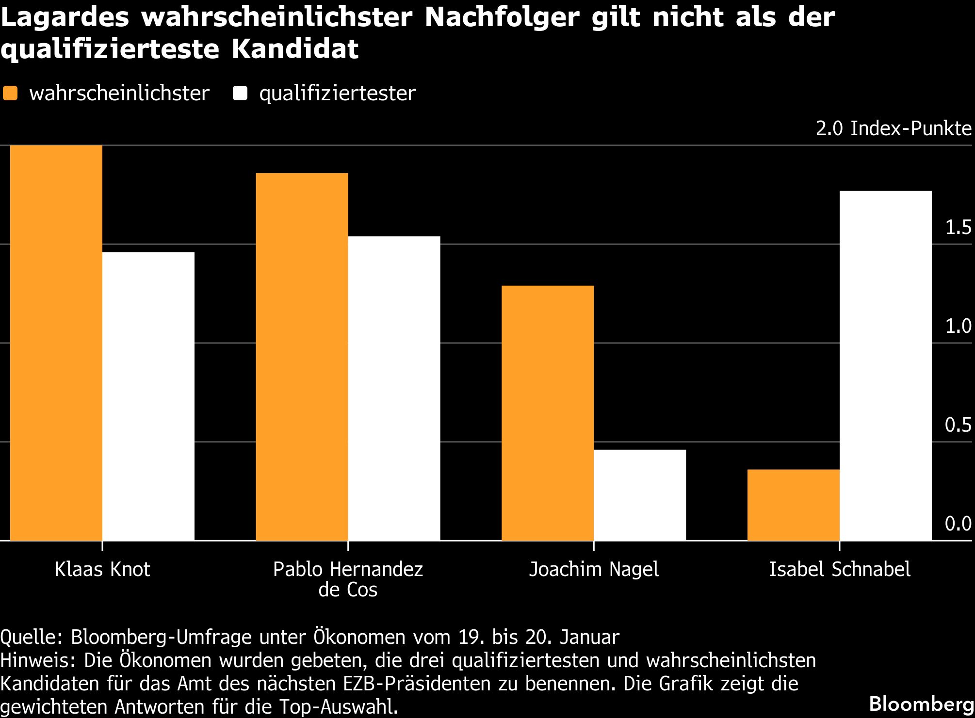 Der Niederländer Klaas Knot, dessen Amtszeit als Präsident der niederländischen Zentralbank im vergangenen Jahr endete, führt ein Ranking an, in dem der Chef der Bank für Internationalen Zahlungsausgleich, Pablo Hernandez de Cos, auf Platz zwei und Bundesbankpräsident Joachim Nagel auf Platz drei folgt. Das ist das Ergebnis einer Bloomberg-Umfrage unter Ökonomen.